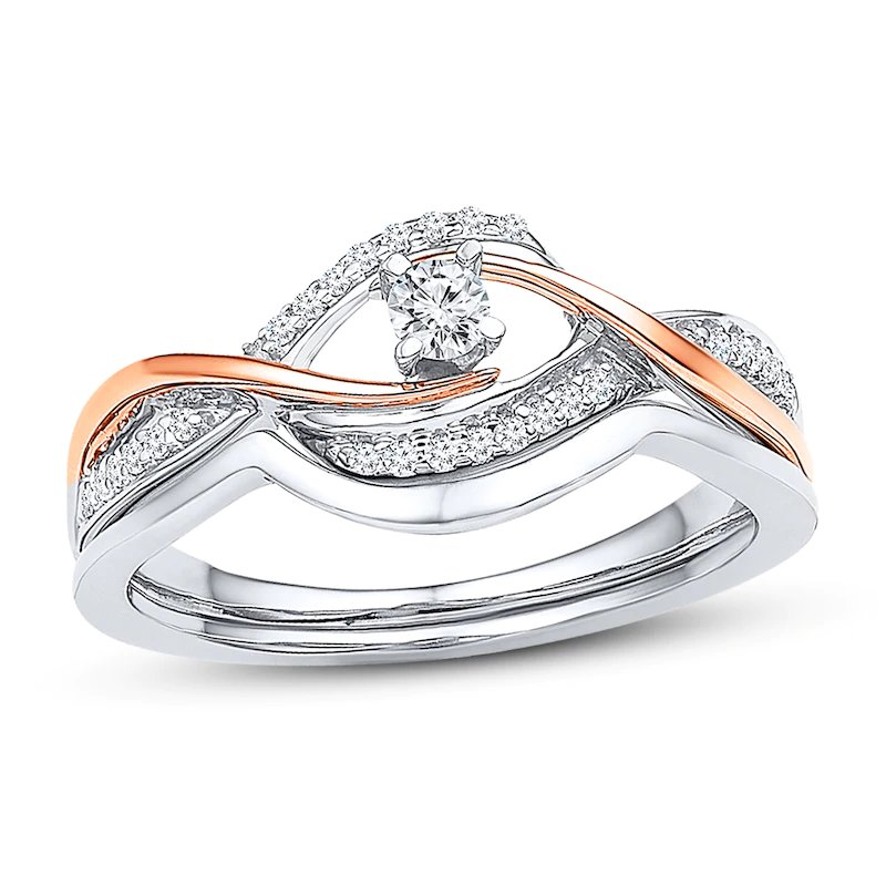 Curves of 10K rose gold and sparkling round diamonds enliven this entrancing promise ring for her, styled in sterling silver. The ring has a total diamond weight of 1/5 carat.